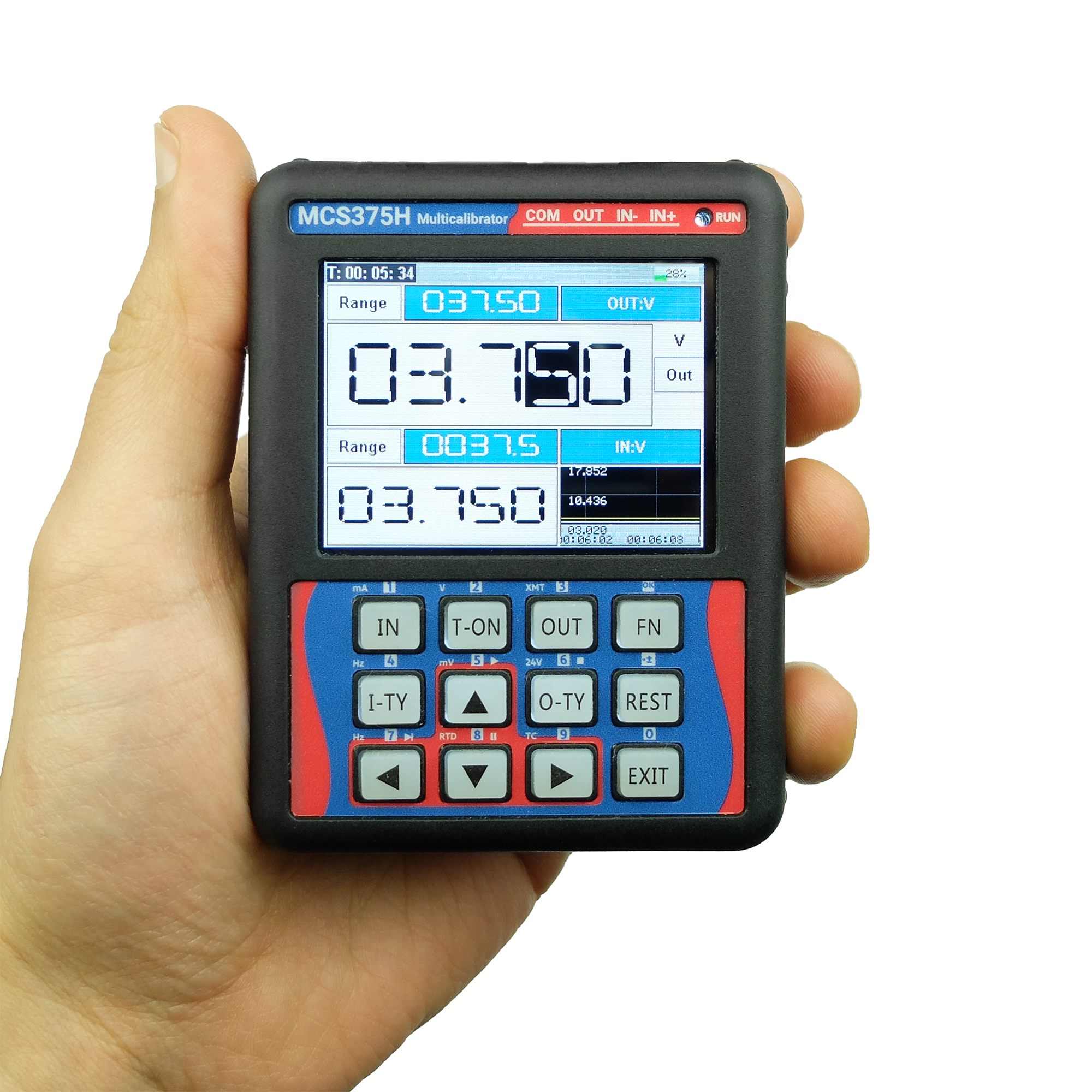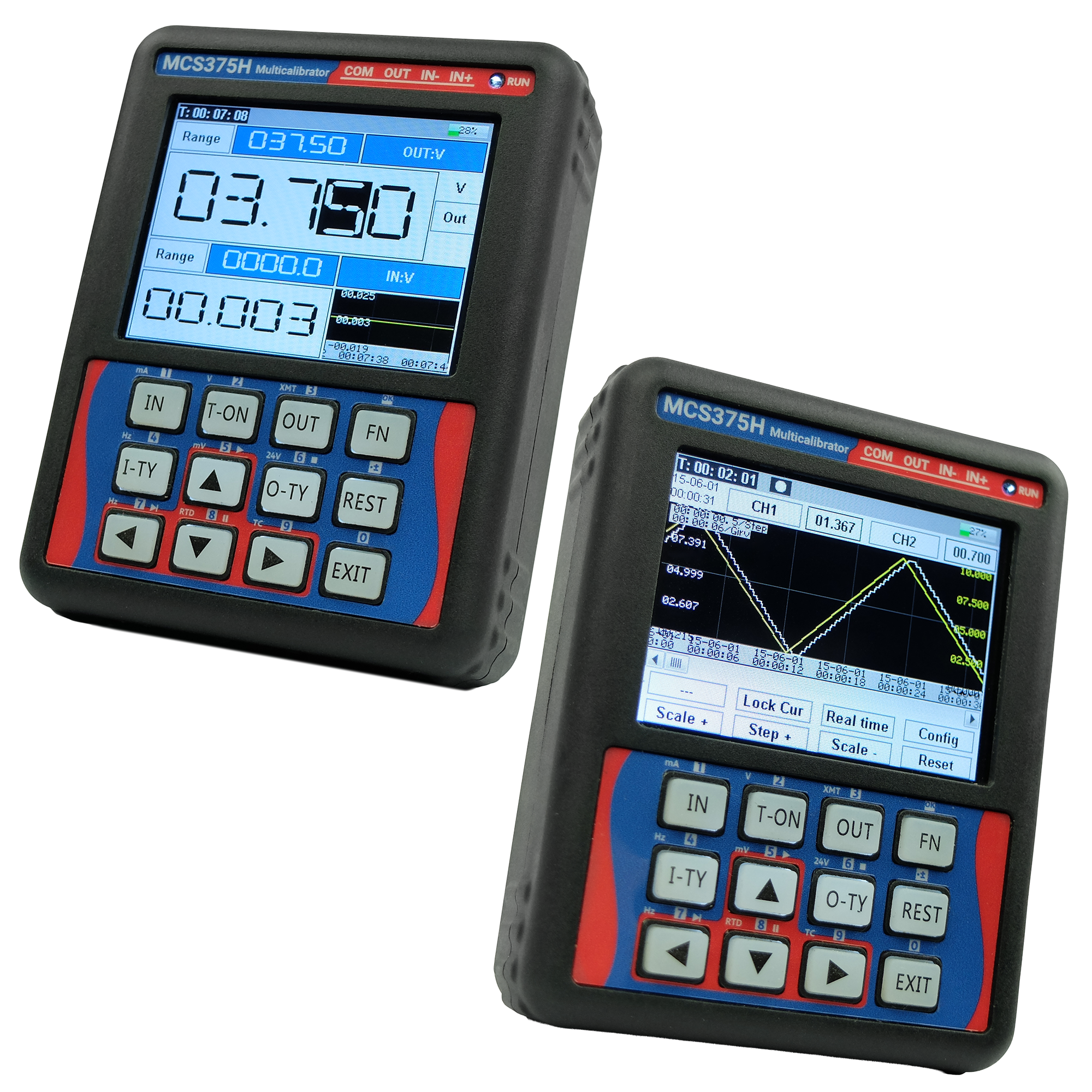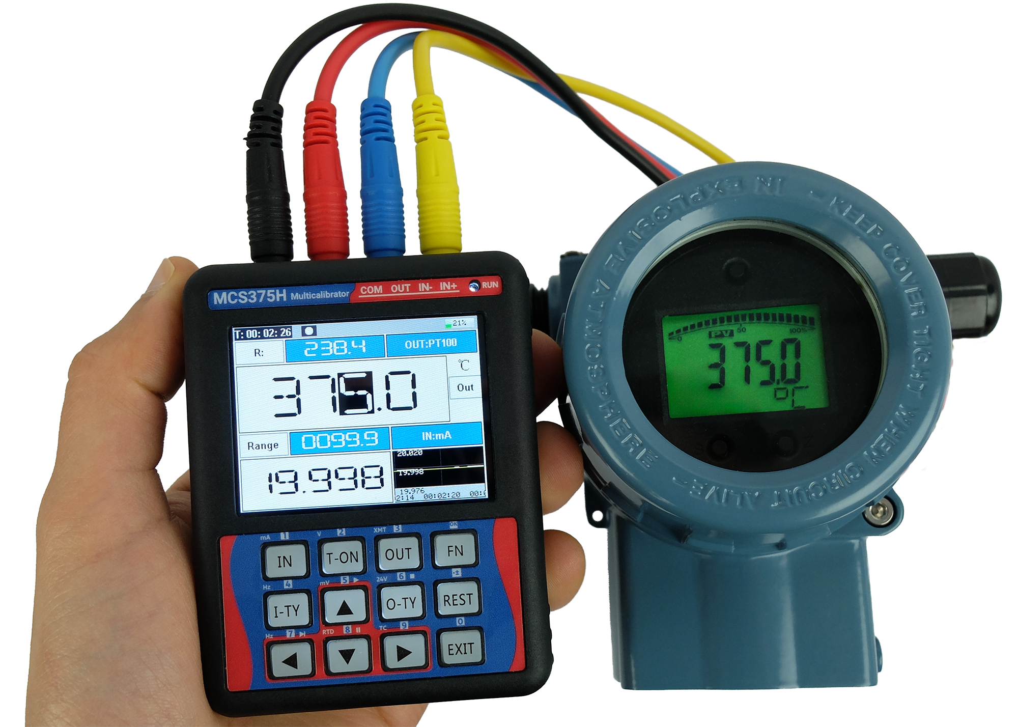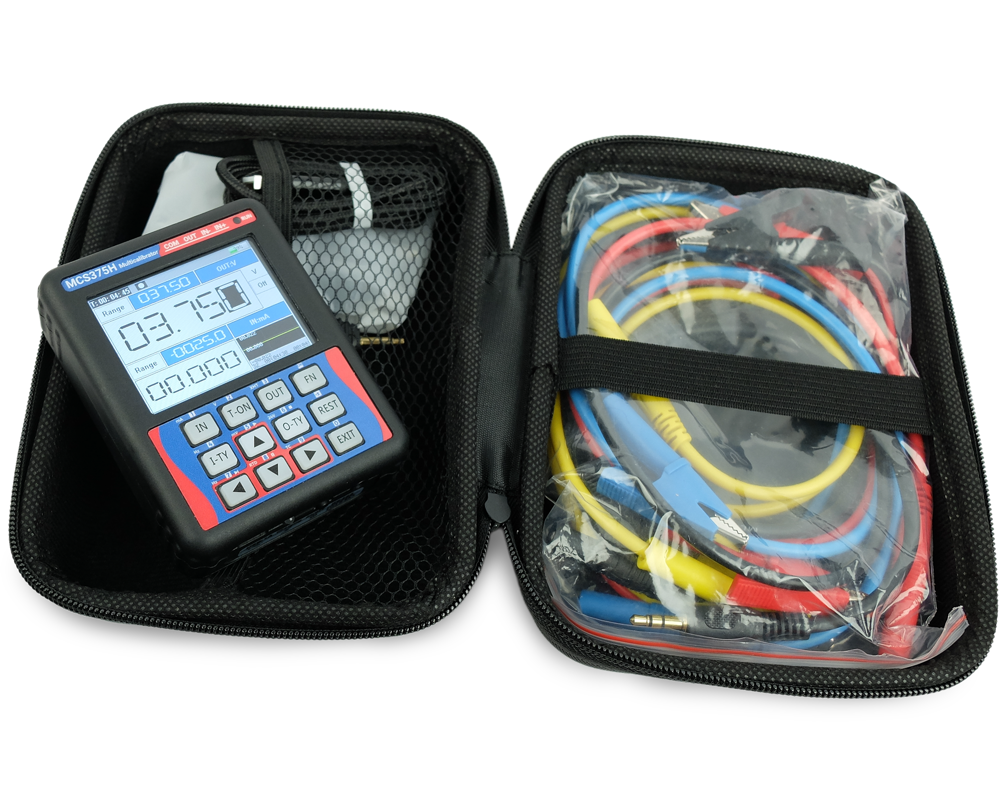 O multicalibrador elétrico MCS375 realiza a medição e a geração de sinais de malha de corrente (4 … 20 mA), tensão (1 … 5 V, 0 … 5 V, 0 … 10 V, 0 … 20 V) e frequência (geração até 100 kHz, medição até 30 kHz). Além disso, o MCS375 é capaz de ler sensores de temperatura termopar (tipos J, K, R, S, T, B, E, N, entre outros) e sensores de termorresistência (Pt100 e Cu50 a 2 fios), além de poder simular a saída desses sensores.